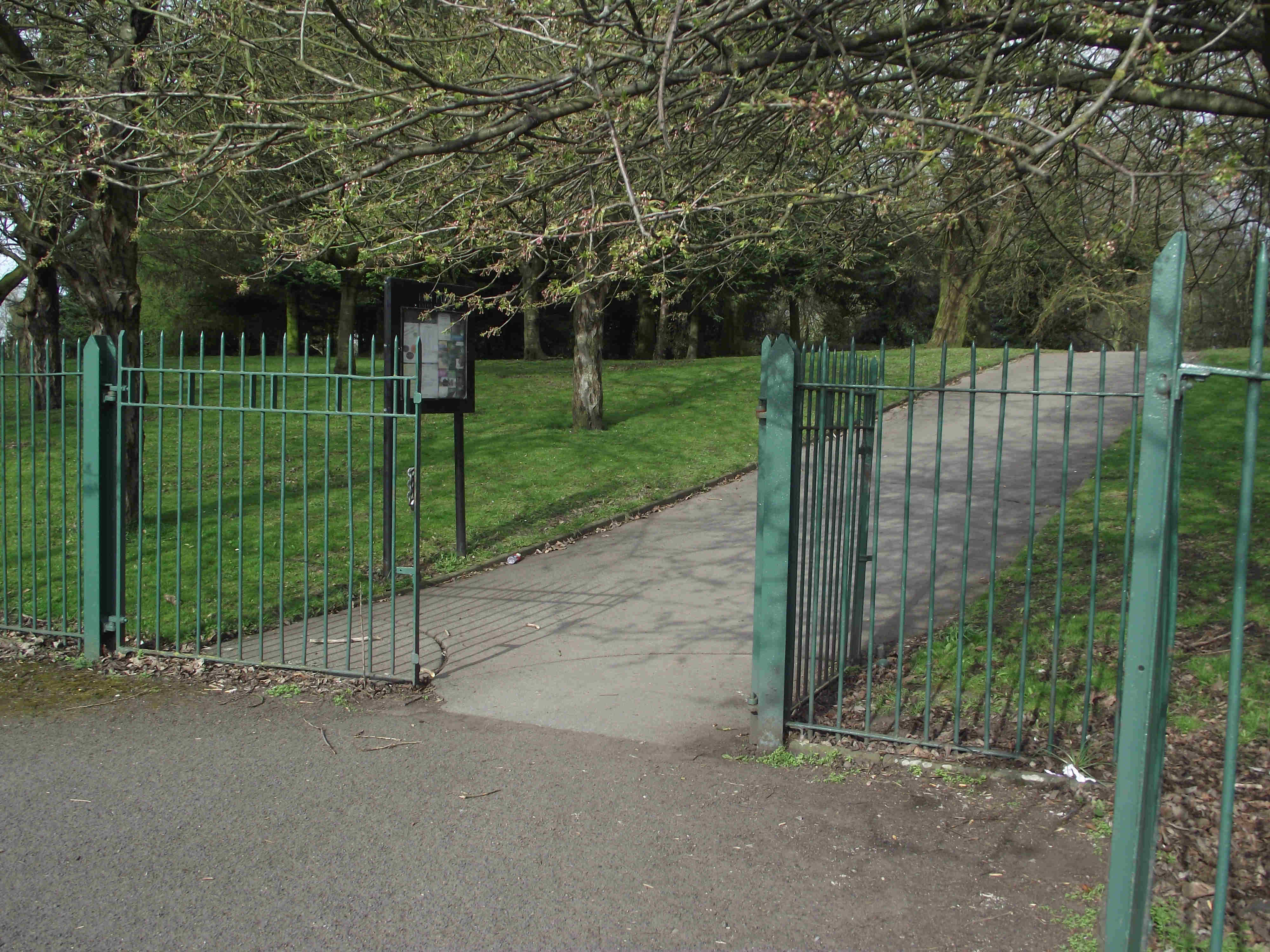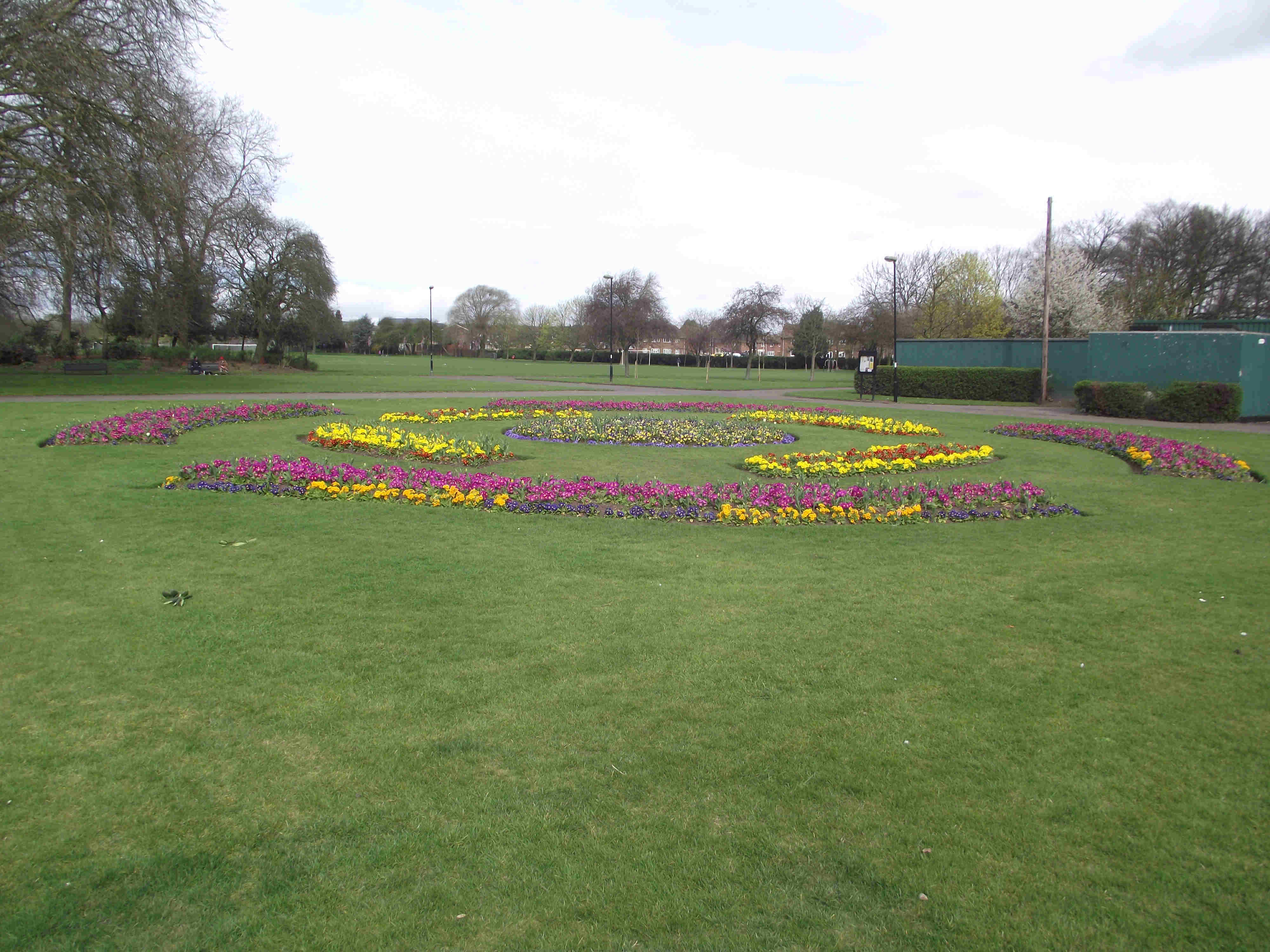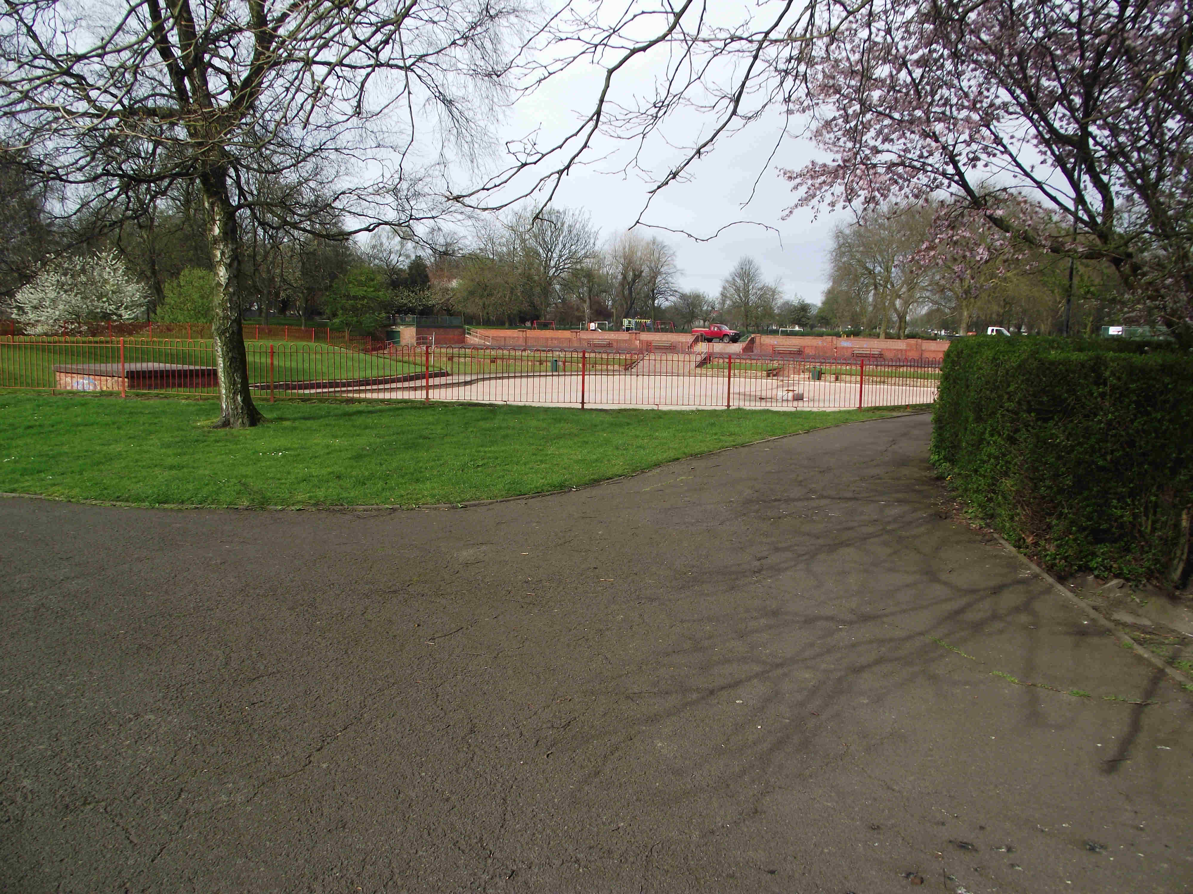 Turn right and enter the park, at the first junction turn right (note the Walk 4 Life Marker here) keep to this main path passing a gate on your right (note if you're in need of refreshments go through this gate to reach some shops) - then retrace your steps into the park) on reaching a Children's Play Area turn right then take the first path left. Pass Tennis Courts on right and a Paddling Pool on the left (often dry). Soon you will reach some Flower beds to the right of the Flower Beds are some huts these are changing rooms for sports teams who use the park. Reaching the end of the Flower beds TL, just ahead and slightly right there is a gate, leave the park via this exit.