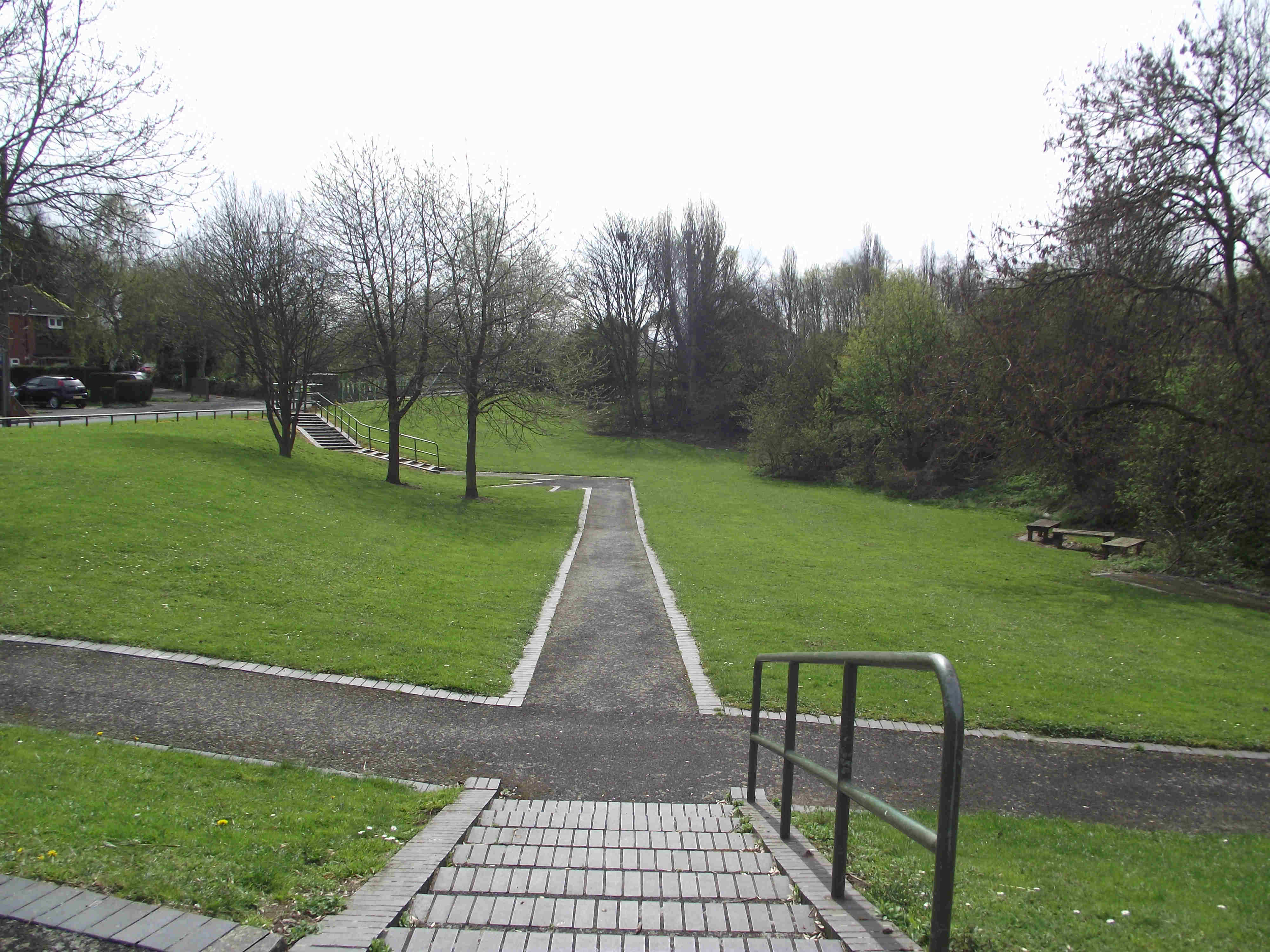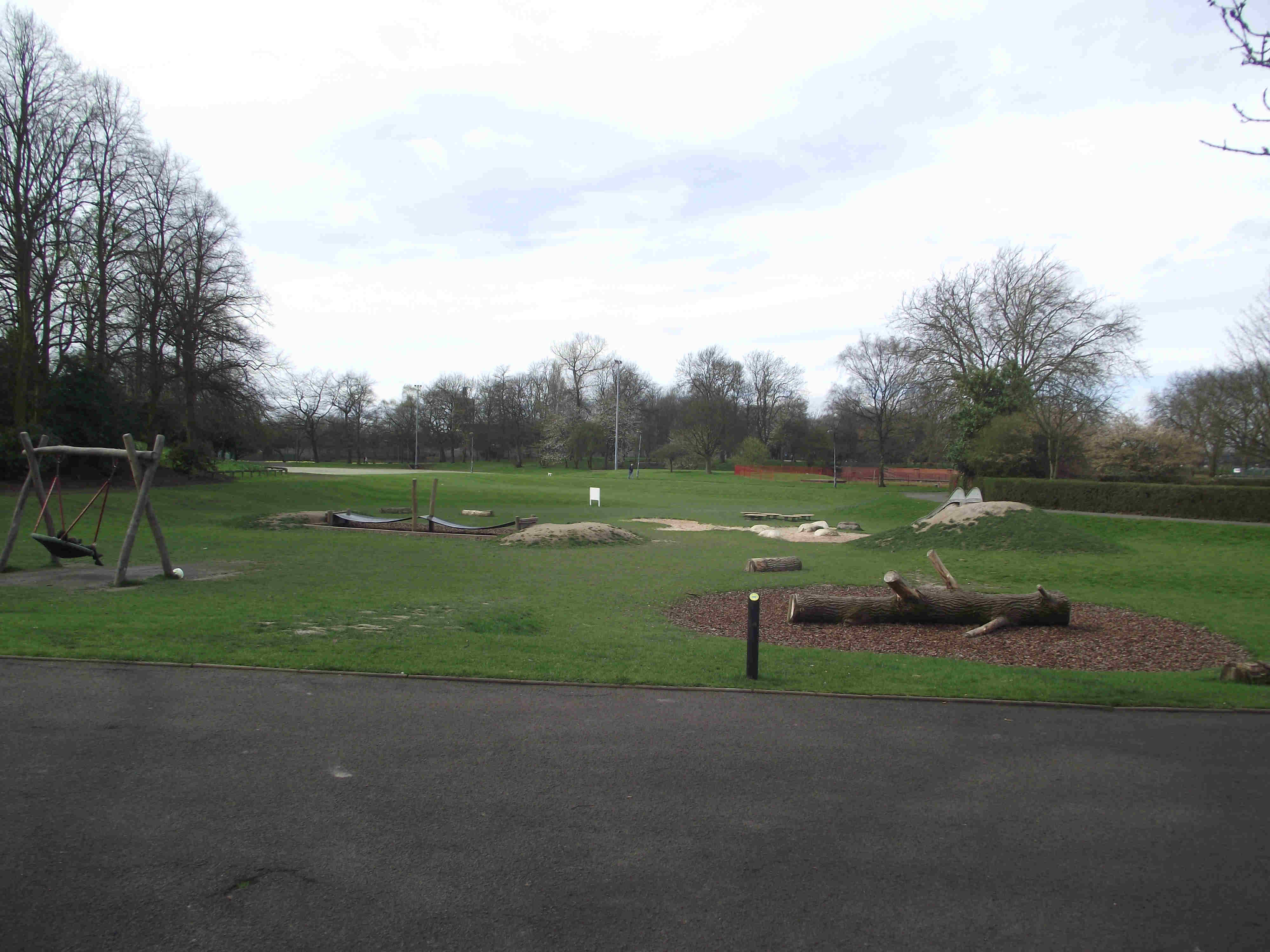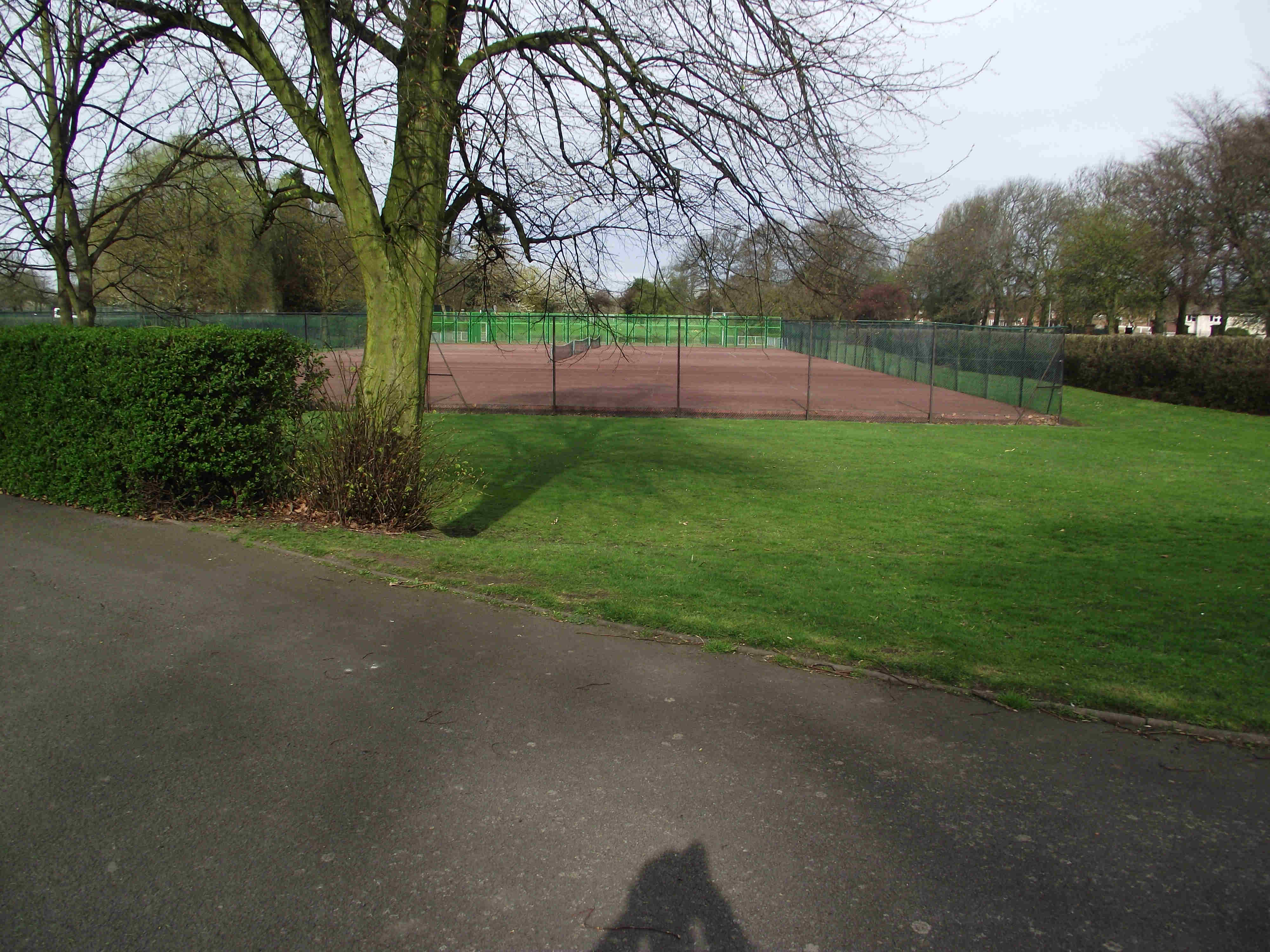 Turn right and enter the park, at the first junction turn right (note the Walk 4 Life Marker here) keep to this main path passing a gate on your right (note if you're in need of refreshments go through this gate to reach some shops) - then retrace your steps into the park) on reaching a Children's Play Area turn right then take the first path left. Pass Tennis Courts on right and a Paddling Pool on the left (often dry). Soon you will reach some Flower beds to the right of the Flower Beds are some huts these are changing rooms for sports teams who use the park. Reaching the end of the Flower beds TL, just ahead and slightly right there is a gate, leave the park via this exit.